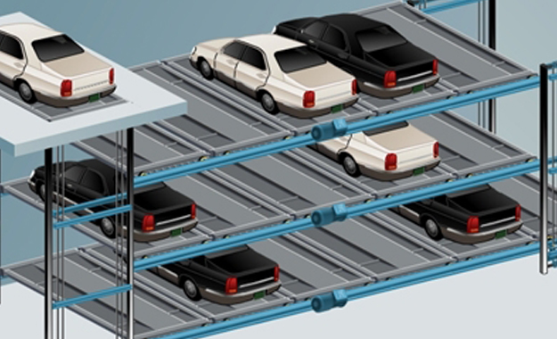 多層循環(huán)類立體車庫通過載車板左右移動和上下移動的相互配合使載車板循環(huán)運(yùn)動,從而實現(xiàn)車輛多層存放。